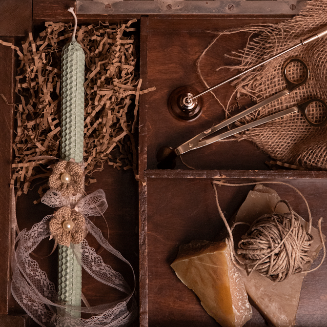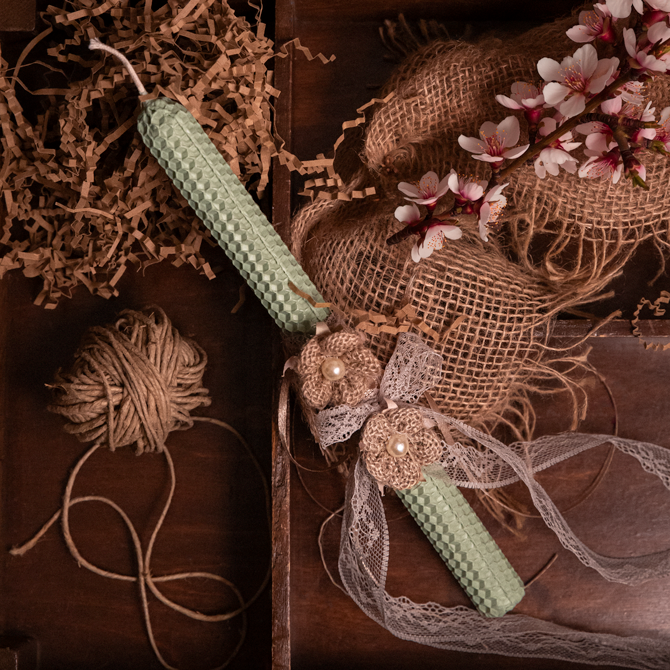 Ρομαντική πασχαλινή λαμπάδα από φυσικό μελισσοκέρι με ανάγλυφη υφή κυρήθρας και κομψή διακόσμηση με διακριτικά λουλούδια και φίνα δαντέλα. Οι απαλές αποχρώσεις και οι λεπτές κορδέλες δημιουργούν μια ιδιαίτερα κομψή σύνθεση με vintage αισθητική.
